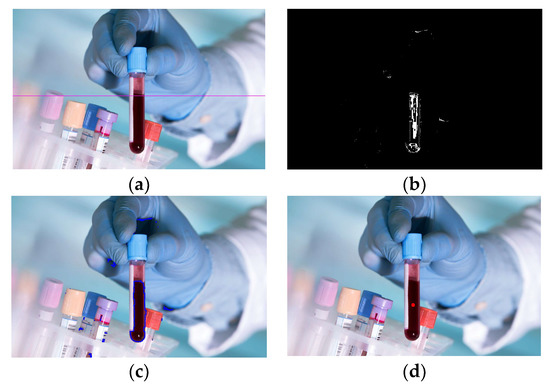 The following initial data were used for blood recognition: N = 32, r = 40, p = 35. The recognition results are shown in Figure 6a–d. Figure 6a shows the result of highlighting the boundary between the blood and another medium; Figure 6b shows the recognition as a binary image, where blood is highlighted in white; Figure 6c demonstrates the possibility of recognition by highlighting the blood contour, and Figure 6d by marking the found volume of blood by a dot. As can be seen from Figure 6, the algorithm made it possible to identify both the level of blood in the tube and its contour.