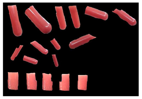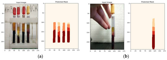 The net convolutional neural network, trained on manually labeled images of a tube with a centrifuged sample of venous blood, provides a high accuracy of image segmentation of the order of 97–98%. This takes into account the nature of the fractional interface, which ensures that the maximum number of aliquots is obtained while maintaining a high quality of the diagnostic investigation. The results of the recognition using the algorithm based on the U-Net neural network are shown in Figure 15.