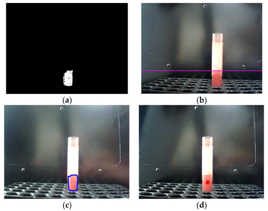 Results of the recognition of a sample of tinted water: (a) Binary image of the sample; (b) Highlighting the upper border of the sample with a line; (c) Highlighting the sample with a contour; (d) Marking the volume of tinted water with a dot.