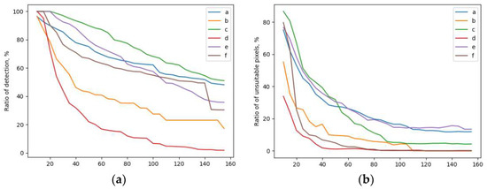 Recognition results: (a) Dependence of the share of the recognizable area on the repeatability value; (b) The ratio of the number of erroneously recognized pixels to the total number of recognized pixels.