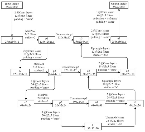 Further, in the decoding part of the network, a series of layers are used, similar to the layers of the coding part, only instead of the Max Polling layer that reduces the size of the image, the layer Upsample is applied, which increases the size of the image by two times on both axes. In addition, the feature maps from the encoding part are concatenated in the decoding part. At the last level, the 1 × 1 convolution is used to generate the output segmented image.