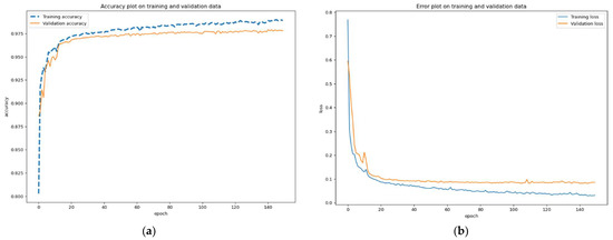 Graphs of the second stage of network training: (a) accuracy plot on training and validation data, (b) error plot on training and validation data.