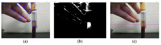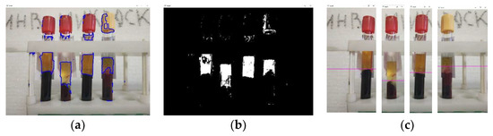 The algorithm for determining the level and contour of blood in images based on the HSV color model and its software implementation also showed good results when tested with pre-selected pixel repeatability level parameters. The same images were processed as with the U-Net neural network using the algorithm based on the HSV color model. For clarity, the operation of isolating blood serum with a blue outline and highlighting on a binary image was also performed. The results of the algorithm are shown in Figure 16. The original image (Figure 16a) was divided into four separate images, so that each image had only one tube with a biosample (Figure 16c) to recognize the boundary between blood fractions.