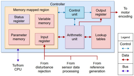 In addition to the use of the physical model of the Siemens drone with identical performance to the real one, a perfect candidate for this application is the FPGA implementation, since it can provide strict real–time execution, high power efficiency, small size, and high reliability, at the cost of a reduced dynamic range. Specifically, the Intel Cyclone 10 LP FPGA was available and corresponded to what was needed; then, it has been used as a reference, and it comes on a minimal board, which is useful for actual power consumption tests and fast prototyping, allowing installation on small UAVs for real-world tests. Without going into the details of the FPGA implementation, Figure 3 shows the structure of the implemented controller, which is only part of a complete system architecture. During the implementation on FPGA, the typical problems related to the operations of trigonometric function, their inverse, reciprocal or division, square root, computation of the derivatives, discrete approximation, variables normalization, as well as to the fixed-point arithmetic of the controller and input variables have been addressed. The simulations presented were carried out in a co-simulation environment between Matlab and Simcenter Amesim in order to have a complex model on which to test the controller and were implemented in FPGA at the end.