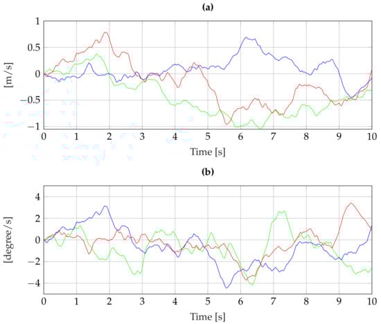 Disturbances for linear and angular velocity: (a) (green), (blue), (red), (b) (green), (blue), (red).