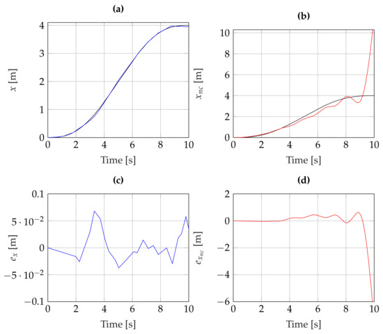 (a) Longitudinal motion of the UAV: the reference (black), x with robust control (blue); (b) Longitudinal motion of the UAV: the reference (black), with non-robust control (red); (c) Longitudinal error motion of the UAV with robust control (blue); (d) Longitudinal error motion of the UAV with non-robust control (red).