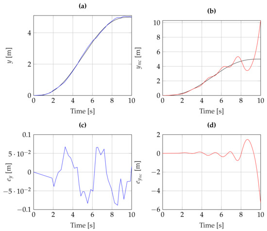 (a) Latitudinal motion of the UAV: the reference (black), y with robust control (blue); (b) Latitudinal motion of the UAV: the reference (black), with non-robust control (red); (c) Latitudinal error motion of the UAV with robust control (blue); (d) Latitudinal error motion of the UAV with non-robust control (red).