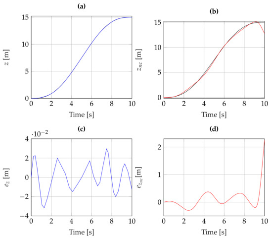 (a) Altitudinal motion of the UAV: the reference (black), z with robust control (blue); (b) Altitudinal motion of the UAV: the reference (black), with non-robust control (red); (c) Altitudinal error motion of the UAV with robust control (blue); (d) Altitudinal error motion of the UAV with non-robust control (red).