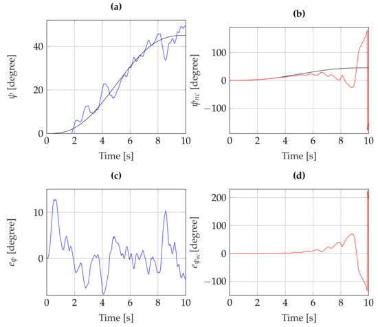 (a) UAV yaw angle: the reference (black), with robust control (blue); (b) UAV yaw angle: the reference (black), with non-robust control (red); (c) yaw angle error of the UAV with robust control (blue); (d) yaw angle error of the UAV with non-robust control (red).