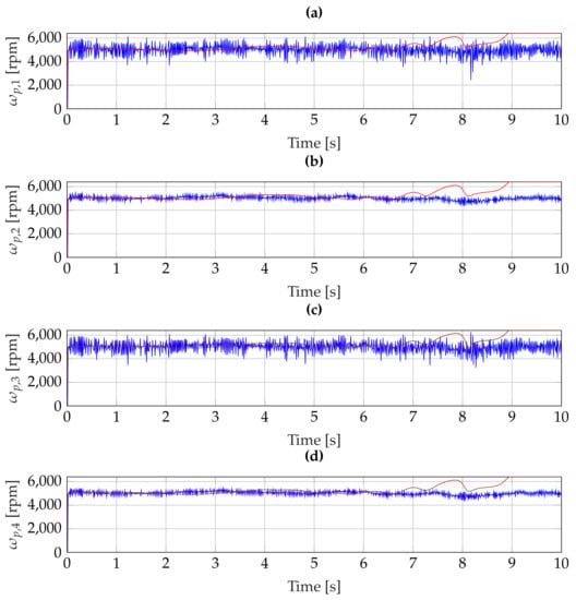 Propulsion angular velocities of robust (blue) and non-robust controller (red): (a), (b), (c), (d).