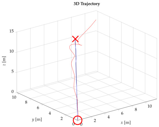 Three-dimensional (3D) drone trajectory: reference (black), robust control (blue), and non-robust control (red). The red circle and the red cross indicate, respectively, the starting and ending point of 3D reference trajectory.