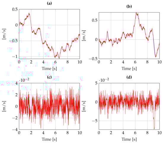 Disturbances estimations: (a) (blue) and (red), (b) (blue) and (red), (c) , (d) .