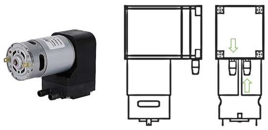 The micro air pump used in this study is a kind of electric diaphragm pump with an intake and exhaust structure, Figure 1. During the compression, the air intake is closed, while the exhaust port is open to form the positive pressure; during the stretch, the exhaust port is closed, and the air intake is open to form negative pressure. The pressure difference appears on the air intake of the air pump and the ambient pressure, and under the pressure difference, the air is sucked into the pump chamber. It is the entire exhaust motion of the micro air pump. Unlike a large air pump requiring lubricating oil and vacuum pump oil, a micro air pump would not pollute the working medium and shows the advantages of small size, low noise, maintenance-free, and continuous running [16].