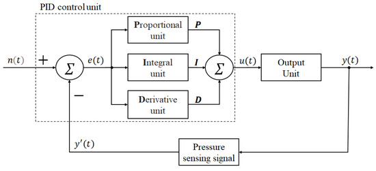 Stable air output is required in this study and the adaptive control presents is important. In industrial control, PID control is a mature control system with broad applications [18,19,20]. It is often used for control feedback to stabilize output signals. PID control technology is suitable for a system and a controlled object not being completed understood or the system parameters not being acquired through effective measurement. A PID controller is composed of a proportional unit (P), integral unit (I), and derivative unit (D), whose parameters of proportional gain, integral gain, and differential gain could be used for modulating the system output characteristics. Figure 2 shows the basic architecture of the PID control module.