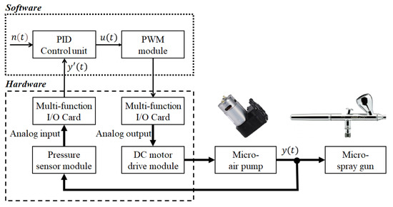 Figure 3 depicts the PID control process, mainly containing two dotted square boxes of software function and hardware function. The software box includes a PID control algorithm and outputs pulse width modulation through programming. NI LabVIEW (National Instruments Co., Austin, TX, USA), the graphic high-level programming language, is used for software development. The hardware box covers a multifunction I/O card (NI USB-6211, National Instruments Co., Austin, TX, USA), a DC motor drive module, and a pressure sensor module. The u(t) in the PID control block is eventually driven for the output unit, which contains a pulse width modulation converting module and DC motor drive module to drive the micro air pump. In order to acquire the feedback signal output for the parameter modulation in the PID control module, a barometric pressure sensor is selected for capturing the pressure change in the pipe, Figure 3.
