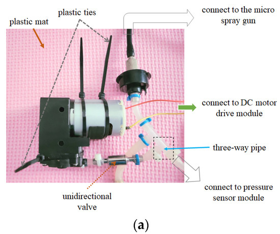 The small air pump, Airpon D2028 (Ningbo Forever Electronic Appliance Co., Ltd., Ningbo, Zhejiang, China) with a working pressure from −70 to +250 kPa, is used as the micro air pump in this study. DC motor drive module with dull-channel full-bridge motor driver chip produced by STMicroelectronics company (Geneva, Switzerland) is used for driving the micro air pump. The driver module with the features of high operating voltage, large output current, strong driving capability, low calorific power, and strong anti-jamming capability is often used for driving relay, solenoid, solenoid valve, DC motor, and stepping motor. To reduce shock at the beginning of the air pump start, the micro air pump is directly fixed on the plastic mat with plastic ties, Figure 4a. Two control signal wires of the air pump are connected to the DC motor drive module so that the exhaust would first pass a unidirectional valve to prevent airflow from backflow and affecting motor operation. The exhaust pipe of the micro air pump, through a three-way pipe, as the dotted square in Figure 4a, is connected to the micro spray gun and a pressure sensor module.