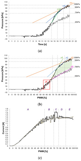 The relationship between the driving motor speed and the current of the micro air compressor is quite complicated, and it will vary due to factors such as structure, power supply, and load. This study used a 12 V micro air compressor. When the PWM duty ratio reaches the maximum percentage rate (100%), the motor will also reach the highest speed. When the motor starts from the static, the speed of the motor is not a linear relationship with the driving current, and it must be known according to the actual experiment. Therefore, to understand the relationship between the speed and current of the driving motor, the current corresponding to different PWM duty ratios must be measured. The correlation characteristic curve of the two is shown in Figure 5c. There are five slope lines in Figure 5b that indicate the pressure delta to PWM duty ratio. The slope is in order p3 > p2 > p5 > p4 > p1, and the unit is kPa/%. The driving current of the corresponding PWM duty ratio is shown in Figure 5c. Compared with Figure 5b,c, which would present the driving currents at each stage. The Area-A area of Figure 5c are the currents when the PWM duty ratio is below 55%. Due to insufficient driving current, the motor is almost un-rotated. Area-B was just starting, so the pressure shown in Figure 5b has not yet stabilized. When the micro spray gun is not started, it can be seen from Figure 5b,c that the current value of the Area-C is large, the current delta is relatively large, and the pressure slope is largest. Currently, the PWM duty ratio is about 69–77%. The current in Area-D is relatively stable. So, when the PWM duty ratio is more than 77%, it can reach stability. When the micro spray gun starts to spray, the p4 slope line in Figure 5b corresponds to the Area-C, D, and E in Figure 5c, the PWM duty ratio is more than 69%, and the current is relatively stable. This should be because the gas starts to discharge, lifting the previous closed chamber effect, so that pump can operate stably; improve efficiency.