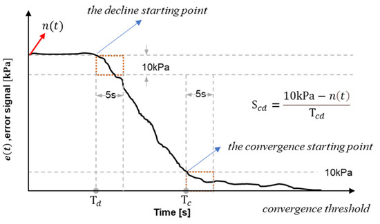 Aiming at the monitoring time interval of the e(t) getting into the convergence state at least higher than 2 s, the monitoring time interval is set to 5 s in our experiment. That is, when the e(t) could be inhibited in the minimal convergence error amount of 10 kPa in 5 s intervals, the experiment achieves the convergence condition. It would be easier to comprehend from the curve in Figure 6. When the pressure of e(t) starts to drop below the convergence critical threshold (10 kPa), the change maintaining below 10 kPa in 5 s is observed. When it conforms to the condition within 5 s, the time point dropping down to 10 kPa is called the convergence time (Tc), also the convergence starting point.