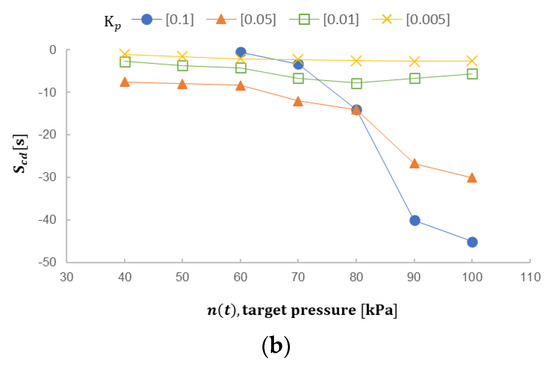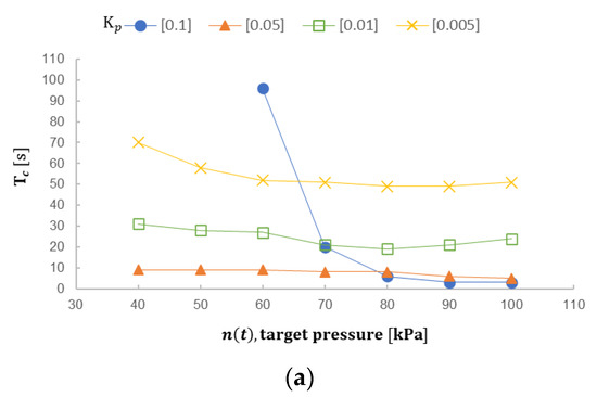 The experimental data are organized in Figure 8. The x-coordinate in Figure 8a is the target value n(t) with the PID algorithm. In this case, the selection of Kp indeed presents distinct effects on Tc, under the same target value. Kp being 0.005, compared with 0.05 and 0.01, appears longer convergence time; when Kp is 0.1, signal oscillation appears at 60 kPa and 70 kPa, without being stably adapted. Furthermore, the convergence time Tc, relative to the target pressure, is out of proportion, and, even when n(t) is 60 kPa, Tc is longer than Kp being set to 0.005. In this case, when Kp is set to 0.1, n(t) should be above 80 kPa to really conform to the convergence condition; it could be viewed from the blue round in Figure 8a. In Figure 8b, convergence decline slope Scd is applied to present the difference under a different target value. It is discovered that the Scd change to the convergence situation of each target value is not big, when Kp is 0.005 and 0.01, maximally dropping the e(t) amount about 7.8 kPa per second. When Kp is 0.05, as shown in Figure 8b, the slope of Scd increases with the increase of n(t), which means that the algorithm can achieve a convergence effect at a similar time when n(t) is between 40 and 100 kPa. As shown in the orange triangle in Figure 8a, the overall Tc are very close.