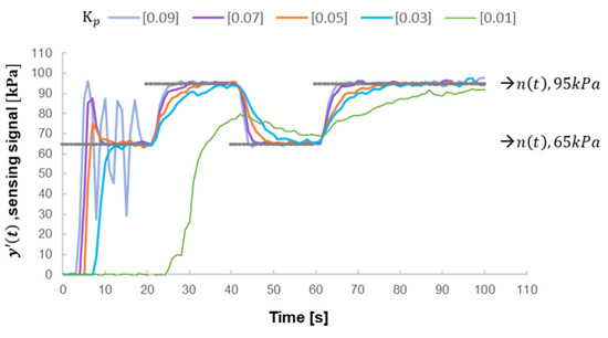 The grey line indicates a pulse-like curve simulating the target value n(t) in 65 kPa and 95 kPa, and converged at 20, 40, and 60 s. Output pressure y′(t) under PID parameter Kp = 0.1, 0.05, 0.01, and 0.005.