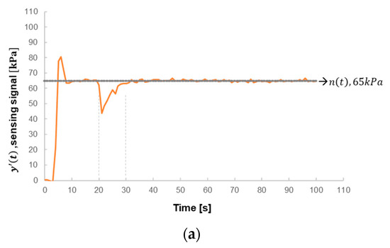 When using a micro spray gun, pressing down the switch for spraying paint results in dropping pressure in the pipe, with a change of about 30 kPa. In this case, a pulse-like sequence variable, target value n(t), is regarded as the target to understand the adaption of PID parameters to different pressure changes. It simulates two target amounts, 65 kPa, and 95 kPa, in the time interval as the alternate output. The sequence data, according to the software planning, would change the n(t) of the system at 20, 40, and 60 s, as the switch between 65 kPa and 95 kPa of the grey curve in Figure 9.
