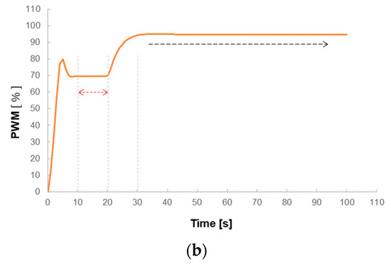 Figure 10a shows the pressure change y′(t) before/after pressing the switch of the micro spray gun. The experimental parameters selected Kp to be 0.05, Ki remained at 0.1, and Kd is 0. The grey line in Figure 10a shows the system locking the target value n(t) on 65 kPa. In this case, the system, after starting, would catch up with the set target value n(t) according to the parameters set by PID. The result reveals to catch up to the target value at about 10 s. When the time achieves 20 s, the switch of the micro spray gun, as the green arrow indicated in Figure 4b, is pressed. It is discovered that the pressure, after pressing the switch, immediately drops about 25 kPa, and PID would control output after the system detects the pressure change. As a result, when the pressure is reduced, PID would increase the percentage of PWM to enhance the exhaust output volume to maintain the pressure at the target value of 65 kPa. Figure 10a shows that it takes about 10 s, after pressing down the switch, to have the pressure return the target value. The process could be viewed through the change in PWM modulation. Figure 10b displays the PWM change after pressing down the switch of the micro spray gun. When the system achieves stability, the PWM modulation value does not appear to large changes, e.g., PWM stably maintains 70% after starting for 10–20 s, as the red dotted double arrows in Figure 10b. When the spray gun switch is pressed at 20 s, PWM starts to increase the output percentage; after 30 s, PWM almost remains at 95%, without much modulation, as the black dotted arrow in Figure 10b.