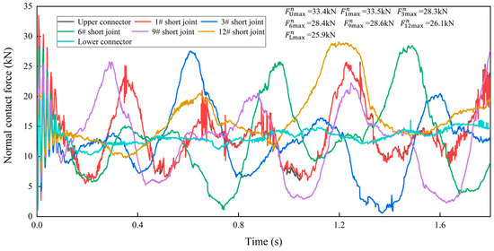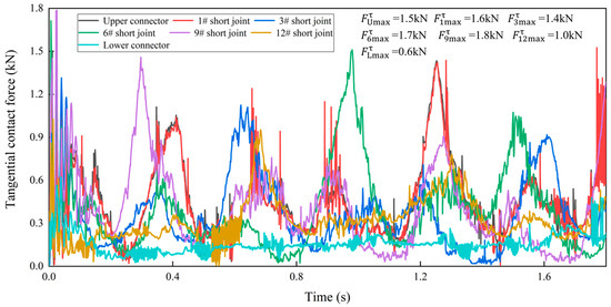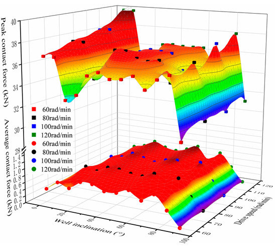 - The contact force between the flexible drill pipe and the guide tube is randomly distributed, and the change in collision contact force is closely related to the borehole curvature radius. When the borehole curvature radius decreases, the contact force increases significantly, and the drilling load loss is very high. The contact force of different flexible joints is in a fluctuation state, and the normal contact force of flexible joints is much larger than the tangential contact force.