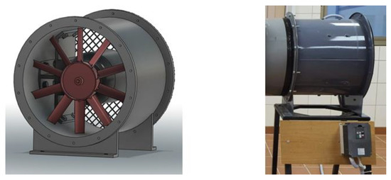 The current wind tunnel consists of an axial fan at the tunnel inlet, a tapered diffuser, a settling chamber with a honeycomb and mesh screens, a contraction cone, and an experimental test section at the tunnel end, which is opened to the atmosphere (Figure 1). The test section’s wind tunnel’s axial fan-driving system provided airflow at the desired velocity while compensating for pressure losses and dissipation. This study uses an axial fan unit with a 0.57 m diameter and an 8.6 kW electric motor to move 16,740 m3/h at 60 Hz through the tunnel. The axial fan had a circular metal case with sheet metal flanges on both sides. A direct-drive motor assembly is set and screwed to the fan hub in the casing. The fan has ten cambered stainless-steel blades. A variable frequency drive (VFD) controls the wind tunnel driving device’s fan frequency from 0 to 50 Hz. Table 1 shows the specifications of the axial fan unit and the variable frequency drive (VFD). Figure 2 displays an axial fan driving unit prototype and 3-D model. The design rules and recommendations found in the essential references [15,31,32] are considered in the design of wind tunnel components to achieve maximum wind speed, flow uniformity, and an acceptable turbulence level in the test section.