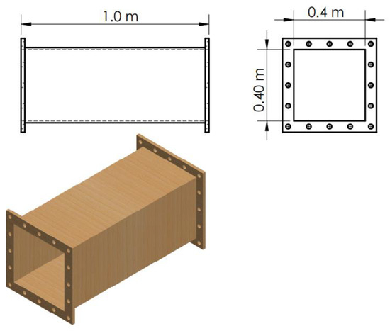 The test section is the most significant element of any wind tunnel, where measurements and observations are done on a model. The test section’s specifications and dimensions considerably influence the specifications of the other wind tunnel components, the tunnel’s total size, and the needed fan power. The test section was planned to be square (Ats = 0.4 m × 0.4 m), with a maximum desired velocity of 30 m/s within the test section, as shown in Figure 3. The test section hydraulic diameter DH,ts is 0.451 m, and the length is chosen to be (Lts = 1.0 m), yielding a length ratio of 2.217, satisfying the condition [33].