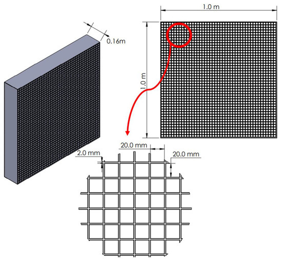 where Dw is the screen wire diameter, Nw is the mesh wire number, Ssc is the settling chamber cross-section side into which the screens are inserted, and is the mesh wire density. The mesh density inverse represents the screen mesh divisions . In the current tunnel, two metallic wire screens are selected to be inserted into the settling chamber frame and positioned downstream of the honeycomb unit in the flow direction. For the selected screens, the mesh wire diameter Dw is 0.7 mm, and the distance between every two wires (wire division) Wm is 3.2 mm. The wiring density ρm is 312.5, and the mesh screen porosity value is 0.61, which satisfies the condition for the optimal mesh performance of [35]. The mesh screen structure with its main dimensions is shown in Figure 6. The settling chamber’s cross-sectional area is the same as the contraction cone’s inlet cross-sectional area (Asc = Ac,i = 1.0 m × 1.0 m) and has a total length of 1.1 m. A distance of 20 cm was used in the design between the screens and the last screen and the entry of the contraction part.