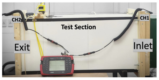 Before a model or object is tested in a wind tunnel, the flow quality, noise, and vibration in the test area of the present blower wind tunnel must be confirmed. Experiments are conducted to examine the flow uniformity by measuring velocity profiles inside the empty test section for different fan frequencies regulated by a speed controller (VFD), with the corresponding setting of 10–50 Hz. The Pitot tube was mounted on the simple slide probe traversing mechanism that moves inside the test section at any specified point in the measuring plane, as shown in Figure 8. To meet the present study’s goal, a rig has been installed in the test section to collect data on the tunnel’s flow noise and vibration. The vibration is acquired using a vibration data collector (COMMTEST, General Electric, Florida, USA). The testing rig comprises a noise meter that measures ambient noise levels generated by the tunnel’s axial fan and construction. In addition, two accelerometers were used to measure the tunnel structure at the inlet and exit sections of the tunnel, as shown in Figure 8.