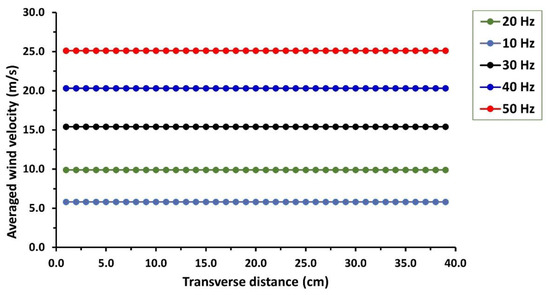 The measured average wind speed in the empty test section is evaluated for all specified points at different fan frequencies in the measured plane section. Due to the same velocity values along the measuring plane points, the velocity results are presented for the points in the middle of the measuring section between the two side walls of the test section for each fan frequency. Figure 9 shows the measured mean stream-wise (longitudinal) velocity profiles of the wind flow at the midplane in the transverse direction between the two side walls of the test section. Wind velocity measurement in stream-wise directions revealed consistent readings in both vertical and lateral directions. It was found that the wind velocity test section increased as the fan frequency increased. From the figure, the mean wind velocity achieved in the empty test section flow ranges from 5.8 m/s to a maximum average velocity of 25.1 m/s for fan motor frequencies ranging from 10 to 50 Hz, according to wind tunnel measuring results. It is seen from the figure at various fan frequencies that a uniform flow velocity profile was observed within the majority of the test section core region (90%) due to the effect of the settling chamber (honeycomb and two screens) and contraction before the test section. The no-slip condition formed a boundary layer at the test section walls. The corresponding Reynolds number Re values based on the measured averaged wind velocity, test section hydraulic diameter, and airflow properties at laboratory room conditions are in the range of . This indicates that a highly turbulent flow regime exists in the measuring test section with a small confined viscous sublayer near the walls of the test section. Therefore, the velocity was not measured in this region.