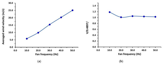 To demonstrate the performance of the current wind tunnel, Figure 10a shows the variation of the measured averaged wind velocity in the test section Vts with the fan motor frequency ƒ. It is seen that the test section’s average velocity increases with the fan frequency. A linear relationship can fit the measured velocity data as in Equation (25) between wind velocity Vts (m/s) and the fan motor frequency (ƒ) in Hz. This fitting relationship for the velocity can be used in future aerodynamic tests to select any test velocity with the corresponding fan motor frequency. Figure 10b shows the measured velocity normalized by (0.4897 ƒ), which gives constant values around 1.03 for frequencies of 20 Hz to 50 Hz and gives 1.18 at 10 Hz. It is noted that the regression Equation (25) is fitted to the entered velocity measurement; thus, the initial value is set from 10 Hz up to 50 Hz. Therefore, it is valid for the measured range.