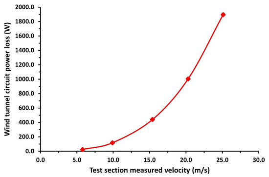 Wind tunnel circuit power loss versus test section measured velocity.