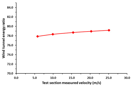 In the prediction results, (RF = 1.1) was taken as the reserve factor for air leakage from the current wind tunnel. The wind tunnel circuit power loss ET,circuit was calculated for all the measured mean velocities in the test section and is represented in Figure 12. This figure shows the increase in wind tunnel circuit power loss with increasing wind speed. The predicted energy ratio ER for the current wind tunnel was obtained at various measured speeds and is shown in Figure 13. The figure shows that the energy ratio is almost constant for all speeds, with an average value of about 79% ± 0.5.