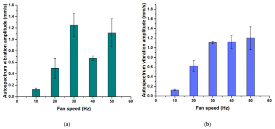 On the other hand, it was observed that the fan frequency at 40 and 50 Hz had a significant amplitude at half orders; thus, the values recorded were at the 4.5th and 2.5th, respectively. The structure’s resonant frequency appeared to be 30 Hz. These results explain the increase in the vibration amplitude of the fan frequency at such a value. Total vibration amplitude was measured at a frequency of 10 Hz. Thus, it was found that the fan frequency directly affects the total amount of vibration generated by the wind tunnel. For example, the total vibration also increased as the fan’s speed increased. The maximum vibration was observed at a fan frequency of 50 Hz, while the minimum amount was seen at a fan frequency of 10 Hz. When the highest frequency was measured, i.e., 50 Hz, the maximum total vibration amplitude was obtained at 1.15 mm/s. This observation is explained as follows: At lower frequencies, the overall vibration level increases with fan frequency because the rotor blades are not moving fast enough to induce significant vibrations.