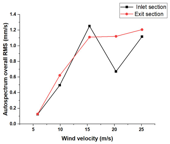 The effect of fan frequency on the vibrations of the wind tunnel structure was measured as a total value in mm/s using accelerometers attached to the wind tunnel structure at various locations along the axial direction of the test section. In the outlet test section of the wind tunnel, it was found that as the fan frequency increased, the vibrations also increased. Figure 14a shows the relationship between the motor fan frequency (Hz) and the corresponding total vibration amplitude of the auto spectrum in mm/s in the inlet test section. A significantly higher amplitude was observed at a fan frequency of 30 Hz. This led to the measurement being repeated more than four times to determine the exact vibration value of this speed. However, an expected set of vibration amplitudes was observed in the output range, as shown in Figure 14b. The bump test is one of the most basic methods for determining the natural frequencies of a structure. The wind speed affects the structure’s vibration. When the wind speed is high, the structure vibrates more, and this can be observed in both measured locations in the inlet and exit test sections, as shown in Figure 15. This is because the wind whips around the structure, making it vibrate; however, when the wind speed is low, the structure vibrates less. This is because the air does not move around the structure as much. When this happens, the wind has less effect, so the structure does not vibrate as strongly. The inlet section shows fluctuations in the resultant vibration more than the exit section, which can be attributed to the stability of the flow at the end of the test section.