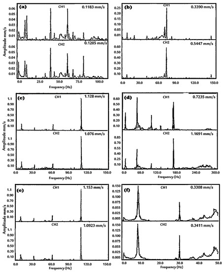 Autospectrum vibration response of the wind tunnel structure at the inlet (channel 1-CH1) and exit (channel 2-CH2) (a–e) is the frequency domain signature for 10, 20, 30, 40, and 50 Hz fan frequencies, and (f) the bump test response.