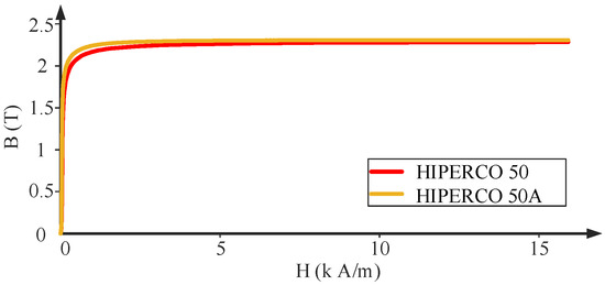The performance of an SRM is highly dependent on the magnetic properties of the core material. To maximize torque density, the magnetic core material of the stator and rotor cores should be selected carefully. The material must exhibit low core loss and high saturation flux density. In light of their unique characteristics, HIPERCO® has been investigated as the core material. Iron–cobalt vanadium alloys, such as HIPERCO® 50 and HIPERCO® 50A, have the highest magnetic saturation (2.4 Tesla) of all soft magnetic alloys [22]. Besides, they have low core loss that can contribute to improving the efficiency of an SRM.