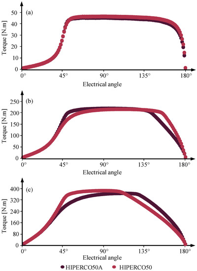 Figure 2. Comparison of static torque production with HIPERCO® 50 and HIPERCO® 50A for the dimensional constraints and current density levels of LSA SRM: (a) J = 5 A/mm2, (b) J = 15 A/mm2, and (c) J = 25 A/mm2.