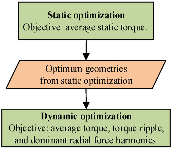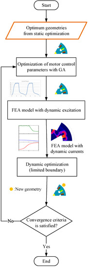 Figure 6 shows the block diagram of the dynamic optimization stage. It integrates the control optimization and tuning of the motor geometry in a design loop. The dynamic design process is performed for each of the geometry combinations calculated from the static design. Table 2 shows the changes in the motor geometry and performance improvements from the initial iteration to the last iteration for the selected final design. After five iterations of the dynamic optimization, 3.4% higher average torque was achieved, torque ripple remained the same, and the radial forces were improved.