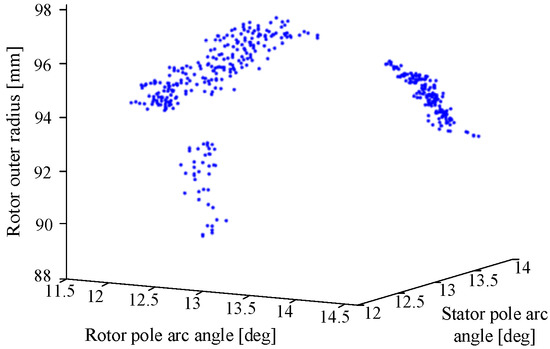 The static design for the given constraints and objectives found a list of more than 260 geometry combinations with high static average torque. Figure 5 shows the distribution of these combinations with respect to the geometry parameters that have the highest correlation to average torque. The resulting clustered data is verified with FEA models to ensure that the surrogate model was accurate. The error of the surrogate model was less than 0.9%.