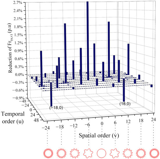 Figure 7 shows the reduction in the radial force harmonics after five iterations. Significant reductions are observed in the magnitudes of circumferential orders zero, six, and twelve. There was a slight increase in the magnitude of the circumferential order eighteen, which would potentially excite vibration mode zero due to sampling effect. The increase in the magnitude of the circumferential order eighteen is smaller than the decrease in the circumferential order zero. Therefore, the optimization process has reduced the radial force harmonics while improving the average torque.