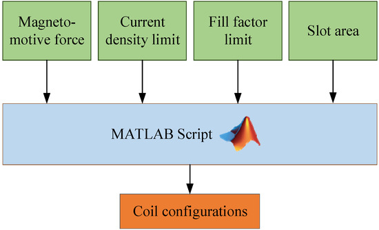 Figure 8 shows the block diagram of the script developed to identify the possible coil parameters based on the fill factor, current density limit, and magnetomotive force. The magnetomotive force is calculated based on the simplified stranded coil conductor region of the final model from the dynamic design loop. The current density limit is based on the cooling method, and the slot area is based on the selected geometry. Table 3 lists the feasible coil configurations calculated from the script. As highlighted in the table, the six parallel winding options are preferred. This is because parallel winding enables coils with a higher number of turns and fewer strands. Fewer strands allows an easier implementation of the coils. If a coil is designed for a high number of strands, it might be necessary to wind the strands one at a time for the given number of turns, especially when a winding machine is used. Therefore, using fewer strands helps avoid resistance mismatch between the strands of a coil. Fewer strands also enable better wire layout in the coil implementation, which helps achieve a more consistent resistance in each coil and, hence, more balanced phase resistances. Besides, a parallel winding configuration helps mitigate unbalanced magnetic pull in case of eccentricity [24].