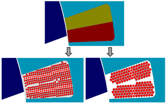 The preferred coil options for parallel winding configuration are summarized in Table 4. Both options have similar phase resistance, fill factor, and current density. The first option uses a thicker wire (17 AWG), but a single strand. The second option uses a thinner wire (20 AWG), but two strands. In terms of practical implementation, the first option might require higher bending force and the second option might require more complicated layering. It is also essential to calculate the AC copper loss for these configurations to make the final decision. In order to simulate the AC copper loss, both coil options are tested with individual wires in FEA. A Python Pyflux function is developed to automate the conversion from solid conductors to individual wires, as shown in Figure 9.