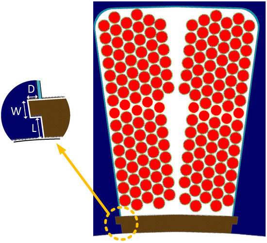In order to ensure that the coils are secure inside the stator slots, a slot wedge design is considered. The stator of the LSA SRM is designed without pole shoes so as not to impact the flux path and cause a potential reduction in electromagnetic torque. Therefore, the stator teeth are designed with grooves to insert the slot wedge as shown in Figure 11.