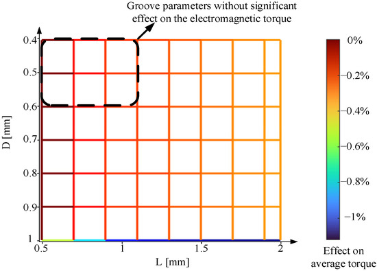 Figure 12 shows the effect of the groove on the torque production with a width of 0.8 mm. The boundary within which the groove parameters can be defined without a significant effect on the torque production is shown in a dashed rectangle. Based on the analysis, the dimensions of the grooves are set as W = 0.8 mm wide, D = 0.5 mm deep, and L = 1 mm away from the edge of the stator teeth, as referred to Figure 11.