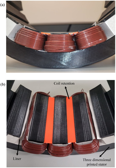 It is essential to experimentally verify that the designed coils can be wound, inserted into the stator slots, and then the designed slot wedges can be applied to retain the coils. This also confirms the fill factor calculations and ensures that the stator core can be manufactured with the optimized dimensions. For this purpose, the stator core is 3D printed as shown in Figure 13. The slot retention wedge is prototyped by 3D printing using glass-filled nylon or durable nylon. Considering the size of the part and the required accuracy, selective laser sintering (SLS) 3D printing is applied. These materials are mechanically and thermally strong; they have been used in prototyping for similar purposes.
