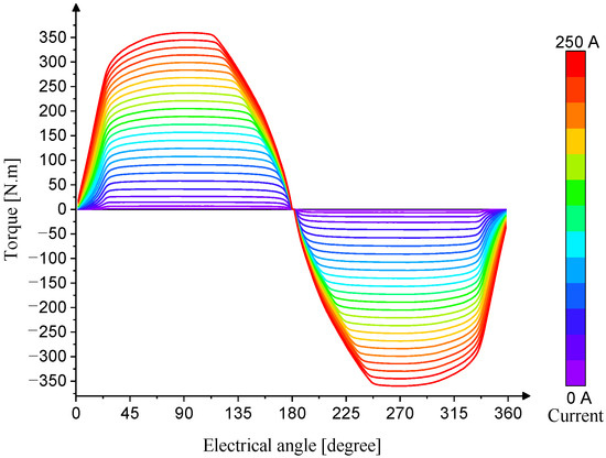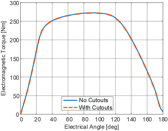 The static electromagnetic performance was analyzed for the new SRM geometry with the tapered elliptical rotor cutouts. The static electromagnetic torque was studied for half an electrical cycle in the motoring region at 2600 rpm with a current reference of 195 A. As shown in Figure 16, there was no significant difference in the torque with the proposed rotor cutouts. The maximum deviation in torque before and after the cutout is 3.36% near the aligned position. On average, the static torque production deviates only 0.35% compared with the case without the cutouts.
