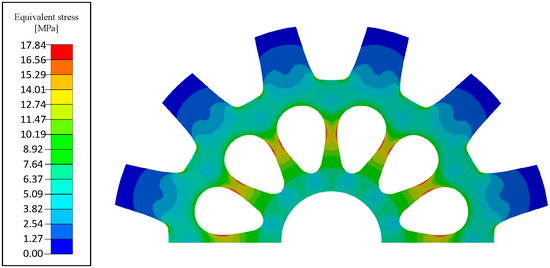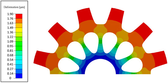 The rotor cutouts are structurally validated using total deformation and von-Mises stress analysis as depicted in Figure 18 and Figure 19. For a single rotor lamination with the HIPERCO® 50A material, the analyses were carried out for the rotor with and without the cutouts at the maximum operating speed of 4500 rpm. The maximum displacement with no cuts is 1.3 µm, and with the cutouts it was 1.9 µm. The maximum deviation is within the rotor airgap clearance, and this ensures that there would be no contact. The maximum stress experienced by the reduced-weight rotor was 17.84 MPa, which is well below the material’s yield strength of 212 MPa. From the following analysis, it can be concluded that the rotor-mass reduction would not compromise the mechanical operation of the motor at the maximum operational speed.
